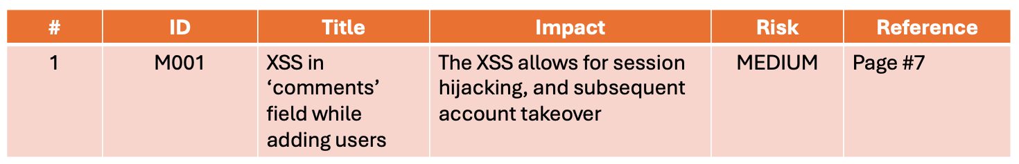usual suspects to go here (#, ID, title, small description with impact, risk rating, reference to the location in current document). Here's an example.