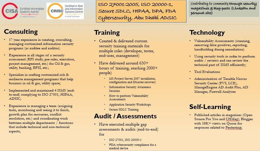 ..more than 17 years experience in creating, consulting, managing customized information security programs;
